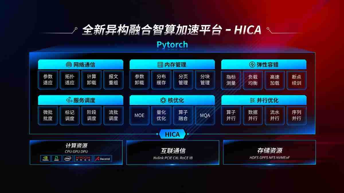 通过自研的服务层、、、中间适配层、、以及调度编排算法,,,采用数据并行、、模型并行等多种并行方式,,,,把并行计算任务进行有效的分解,,,使其分别由相应的软件栈和算力资源来承接。。。当GPU资源变化,,,HICA可以实时动态调度计算子任务并调整模型拓扑和架构,,,,以充分聚合各种算力资源。。